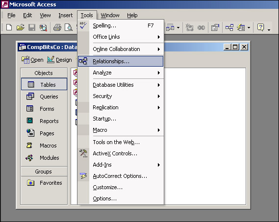 First we need to choose Relationships from the Tools menu, as shown in Figure 17-15.