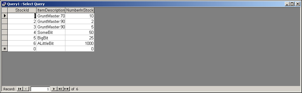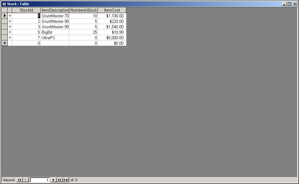 We mentioned earlier the concept of a record, which consists of data corresponding to a group of fields. For example, if we had an item called a Widget, with 10 in stock, and they cost $10.99, then our ItemDescription field would hold Widget. NumberInStock would hold 10, and ItemCost would hold $10.99. Collectively this data is called a record. A table can have many, many records. For example, a second record might show that ItemDescription is BigWidget, NumberInStock is 7, and ItemCost is $16.99.