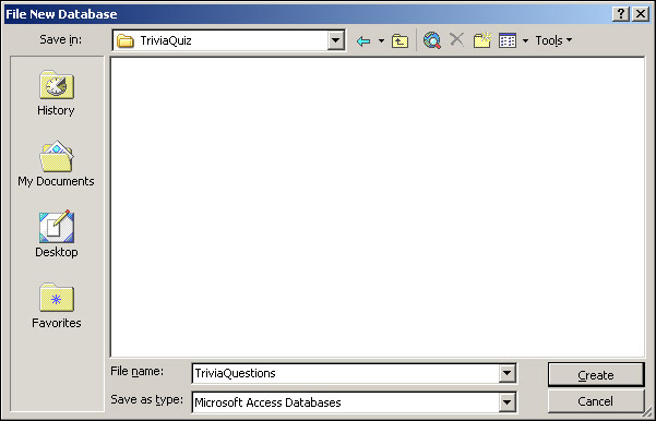 In the next dialog box, shown in Figure 17-45, we're given the option to name and save the database. Call it TriviaQuestions.mdb. I've saved mine in the C:\Temp directory, but any directory is fine. Remember where you save the database, because its location will be used in the web pages later. Click Create.