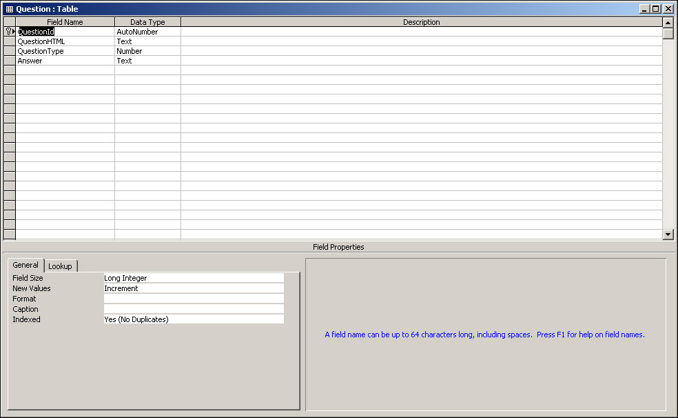 Create the Question table first. The fields are shown in Figure 17-47, along with suggested field sizes, which we change under the General tab.