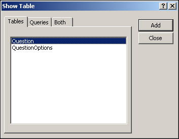By including the options as rows in another table, we help reduce redundant fields and we can choose to have as many or few options for each question as we like. After all, options are just rows or records in the QuestionOptions table. We'll also see later that having a separate table for the options makes the programming a little easier. We can create the options in the page by just looping through a recordset from the QuestionOptions table until we hit Eof, rather than having to find some way of guessing how many fields are used and how many are redundant.