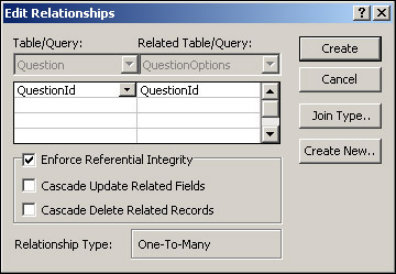 With the Relationships diagram now open and our two tables displayed, click on the QuestionId field in the Question table and, holding the mouse button down, drag over to the QuestionId field in the QuestionOptions table; then let go. The Edit Relationships dialog box should appear as shown in Figure 17-50. Make sure you check the Enforce Referential Integrity box. Doing so will prevent question option records for which there are no questions from appearing in the QuestionOptions table.