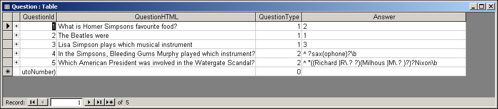 Some questions require a text answer typed into a text box. Others, such as Homer's favorite food question, are multiple-choice questions. The field QuestionType will contain a number indicating the type of question, such as plain text or multiple-choice, that the record deals with.