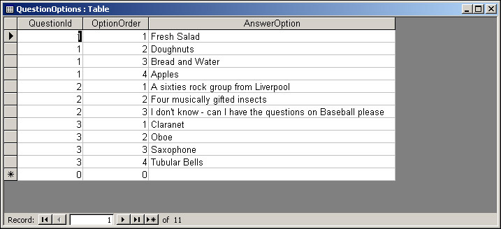 We've used the OptionOrder field of the QuestionOptions table to specify the order for the options for any particular question. Finally, the text displayed to the user for each option is given in the AnswerOption field.