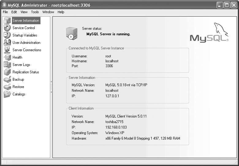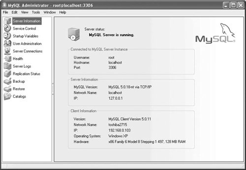 A very welcome addition to the MySQL family of products is the free (free!) MySQL Administrator. This is a graphical tool that will run on most operating systems, starting with Windows, Mac OS X, and Linux. The application works with MySQL servers versions 4.0 and greater.