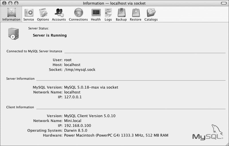 | 6. | Use the Server Information (Windows) or Information (Mac OS X) pane to learn about the MySQL and system status (Figures 13.2 and 13.3).