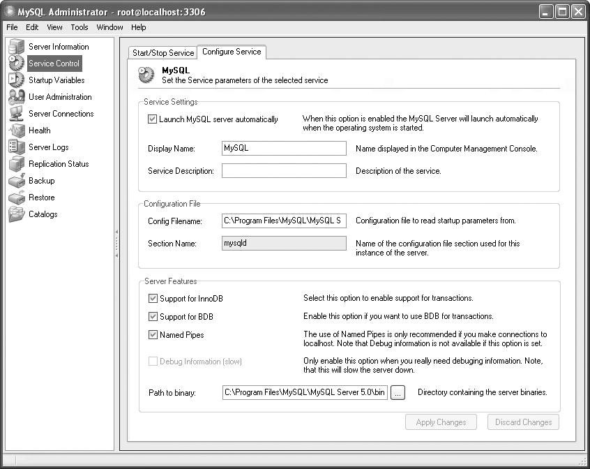 The Windows version of this window ( Figure 13.4) contains more options than the Mac version. With Windows, what you can do here is similar to what you can do in the Windows Services control panel (see Chapter 2, "Running MySQL").