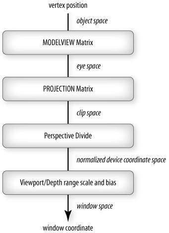 1.9. Coordinate TransformsThe purpose of the OpenGL graphics processing pipeline is to convert threedimensional descriptions of objects into a two-dimensional image that can be displayed. In many ways, this process is similar to using a camera to convert a real-world scene into a two-dimensional print. To accomplish the transformation from three dimensions to two, OpenGL defines several coordinate spaces and transformations between those spaces. Each coordinate space has some properties that make it useful for some part of the rendering process. The transformations defined by OpenGL afford applications a great deal of flexibility in defining the 3D-to-2D mapping. For success at writing shaders in the OpenGL Shading Language, understanding the various transformations and coordinate spaces used by OpenGL is essential. In computer graphics, MODELING is the process of defining a numerical representation of an object that is to be rendered. For OpenGL, this usually means creating a polygonal representation of an object so that it can be drawn with the polygon primitives built into OpenGL. At a minimum, a polygonal representation of an object needs to include the coordinates of each vertex in each polygon and the connectivity information that defines the polygons. Additional data might include the color of each vertex, the surface normal at each vertex, one or more texture coordinates at each vertex, and so on. In the past, modeling an object was a painstaking effort, requiring precise physical measurement and data entry. (This is one of the reasons the Utah teapot, modeled by Martin Newell in 1975, has been used in so many graphics images. It is an interesting object, and the numerical data is freely available. Several of the shaders presented in this book are illustrated with this object; see, for example, Color Plate 24.) More recently, a variety of modeling tools have become available, both hardware and software, and this has made it relatively easy to create numerical representations of threedimensional objects that are to be rendered. Three-dimensional object attributes, such as vertex positions and surface normals, are defined in OBJECT SPACE. This coordinate space is one that is convenient for describing the object that is being modeled. Coordinates are specified in units that are convenient to that particular object. Microscopic objects may be modeled in units of angstroms, everyday objects may be modeled in inches or centimeters, buildings might be modeled in feet or meters, planets could be modeled in miles or kilometers, and galaxies might be modeled in light years or parsecs. The origin of this coordinate system (i.e., the point (0, 0, 0)) is also something that is convenient for the object being modeled. For some objects, the origin might be placed at one corner of the object's three-dimensional bounding box. For other objects, it might be more convenient to define the origin at the centroid of the object. Because of its intimate connection with the task of modeling, this coordinate space is also often referred to as MODEL SPACE or the MODELING COORDINATE SYSTEM. Coordinates are referred to equivalently as object coordinates or modeling coordinates. To compose a scene that contains a variety of three-dimensional objects, each of which might be defined in its own unique object space, we need a common coordinate system. This common coordinate system is called WORLD SPACE or the WORLD COORDINATE SYSTEM, and it provides a common frame of reference for all objects in the scene. Once all the objects in the scene are transformed into a single coordinate system, the spatial relationships between all the objects, the light sources, and the viewer are known. The units of this coordinate system are chosen in a way that is convenient for describing a scene. You might choose feet or meters if you are composing a scene that represents one of the rooms in your house, but you might choose city blocks as your units if you are composing a scene that represents a city skyline. The choice for the origin of this coordinate system is also arbitrary. You might define a three-dimensional bounding box for your scene and set the origin at the corner of the bounding box such that all of the other coordinates of the bounding box have positive values. Or you may want to pick an important point in your scene (the corner of a building, the location of a key character, etc.) and make that the origin. After world space is defined, all the objects in the scene must be transformed from their own unique object coordinates into world coordinates. The transformation that takes coordinates from object space to world space is called the MODELING TRANSFORMATION. If the object's modeling coordinates are in feet but the world coordinate system is defined in terms of inches, the object coordinates must be scaled by a factor of 12 to produce world coordinates. If the object is defined to be facing forward but in the scene it needs to be facing backwards, a rotation must be applied to the object coordinates. A translation is also typically required to position the object at its desired location in world coordinates. All of these individual transformations can be put together into a single matrix, the MODEL TRANSFORMATION MATRIX, that represents the transformation from object coordinates to world coordinates. After the scene has been composed, the viewing parameters must be specified. One aspect of the view is the vantage point (i.e., the eye or camera position) from which the scene will be viewed. Viewing parameters also include the focus point (also called the lookat point or the direction in which the camera is pointed) and the up direction (e.g., the camera may be held sideways or upside down). The viewing parameters collectively define the VIEWING TRANSFORMATION, and they can be combined into a matrix called the VIEWING MATRIX. A coordinate multiplied by this matrix is transformed from world space into EYE SPACE, also ca