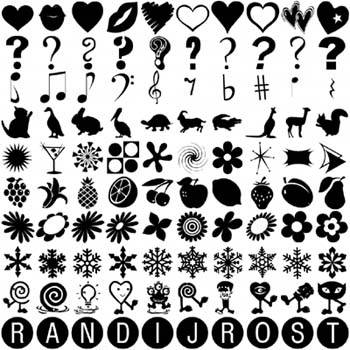 10.6. Glyph BombingIn this section, we develop a shader that demonstrates a couple of different uses for textures. In Texturing and Modeling: A Procedural Approach, Darwyn Peachy described a process called TEXTURE BOMBING that creates an irregular texture pattern. The idea is to divide a surface into a grid, and then draw a decorative element or image (e.g., a star, a polka dot, or some other shape) within each cell. By applying some randomness to the placement, scaling, or rotation of each texture element, you can easily create an interesting pattern that is suitable for objects such as wallpaper, gift wrap, clothing, and the like. Peachey described a RenderMan shader to perform texture bombing, and in GPU Gems, Steve Glanville described a method for texture bombing in Cg. The basic concept of texture bombing can be taken a bit further. Joshua Doss developed a GLSL shader that randomly selects from several collections of related character glyphs. Two textures are used for the so-called GLYPH BOMBING shadera single texture that stores character glyphs and a texture that stores random values. Let's examine how this shader works. 10.6.1. Application SetupThe first step is to create a 2D texture that contains the glyphs that will be used. To set this up, you just need to carefully draw characters on a 10 x 10 grid, using a 2D image editing program like Photoshop. Each row should have a common theme like the image shown in Figure 10.3. A single uniform variable (ColAdjust) is used to select the row to be accessed. Within this row, a glyph is chosen at random, and when it is drawn, it can also be optionally scaled and rotated. Thus, we can easily choose a pattern from a collection snowflakes, musical symbols, animal silhouettes, flower dingbats, and so on. Applying a random color and placing the glyph randomly within the cell add even more irregularity and interest to the final result. Figure 10.3. Texture map showing a collection of character glyphs that are used with the glyph bombing shader