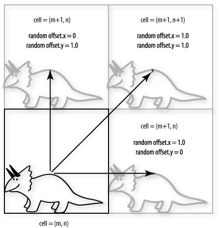 The second texture that this shader uses contains random values in the range of [0,1.0] for each component. We access this texture to obtain a vec4 containing random numbers and use these values to apply randomness to several computations within the fragment shader. Just like the brick shader discussed in Chapter 6, this shader needs a frame of reference for creating the cells in which we draw our glyphs. In this case, we use the object's texture coordinates to establish the reference frame. We can scale the texture coordinates with a uniform variable (ScaleFactor) to make the cells larger or smaller. Our glyph texture map contains only levels of gray. We use the value obtained from the glyph texture map to linearly interpolate between a default object color (ModelColor) and a random color that is generated when a glyph is drawn. Because we are allowing random offsets and random rotation, we need to take care of some complications in our shader. Each of these effects can cause the object we are drawing to extend into neighboring cells. Let's first consider the case of random offsets. When each glyph is drawn, our shader offsets the glyph by adding a value in the range [0,1.0] for each of x and y. This means that the glyph can be shifted over and up by some amount, possibly contributing to the contents of pixel locations in three neighboring cells to the right and above. Figure 10.4 illustrates the possibilities. Figure 10.4. Depending on the random offset for a particular cell, a glyph may contribute to any one of four cells.