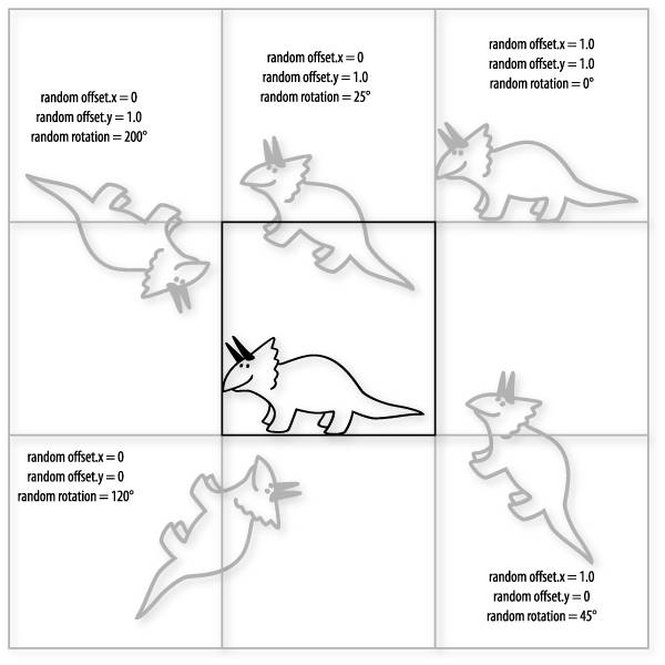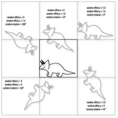 Consequently, as we consider how to compute the value at one particular pixel location, we must consider the possibility that the glyphs to be drawn in cells to the left and below the current cell may be contributing to the fragment. For instance, the spot marked by the x in Figure 10.4 might actually have contributions from the glyphs in cells (m, n), (m+1, n), and (m, n+1) in addition to the glyph contained in the cell (m+1, n+1). Things get even more interesting when we allow for a random angle of rotation. Now the offset combined with rotation can cause our glyph to extend into any of nine cells, as shown in Figure 10.5. For this case, as we render fragments we must consider all eight surrounding cells in addition to the cell containing the fragment being rendered. We use a Boolean uniform variable, RandomRotate, to determine whether we need to loop over four cells or nine. Figure 10.5. Depending on a random offset and a random angle of rotation, a glyph may contribute to fragments in any of nine adjacent cells
