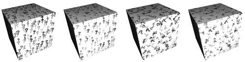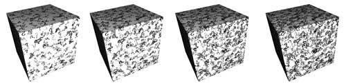This particular shader was designed for flexibility in operation, not performance. Consequently, there are enormous opportunities for making it run faster. There are two texture accesses per iteration of the innermost loop, so enabling rotation and having five samples per cell implies 90 texture accesses per fragment. Still, there are times when some of the techniques demonstrated by this shader come in handy. Some images that demonstrate the flexibility of this shader are shown in Figure 10.6, Figure 10.7, and Color Plate 8. Figure 10.6. Normal glyph bombing, glyph bombing with random scaling, with random rotation, and with both random scaling and rotation.