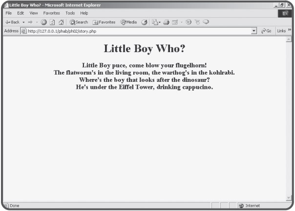 The program asks the user to enter some values into an HTML form, and then uses those values to build a custom version of a classic nursery rhyme. The story program works like most server-side programs. It has two distinctive parts. First, the user enters information into a plain HTML form and hits the submit button. The PHP program doesn't execute until after the user has submitted a form. The program takes the information from the form and does something to it. Usually the PHP program also returns an HTML page to the user.