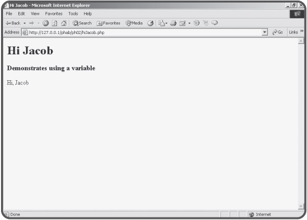 <html> <head> <title>Hi Jacob</title> </head> <body> <h1>Hi Jacob</h1> <h3>Demonstrates using a variable</h3> <? $userName = "Jacob"; print "Hi, $userName"; ?> </body> </html>