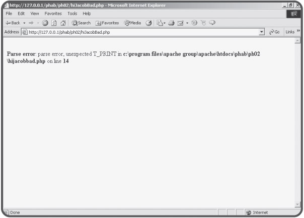 If you look back at the complete code for the hiJacob program, you can see that it has two lines of code inside the PHP block. Each line of PHP code ends with a semicolon. PHP is a more formal language than HTML and, like most programming languages, has some strict rules about the syntax used when writing a page.