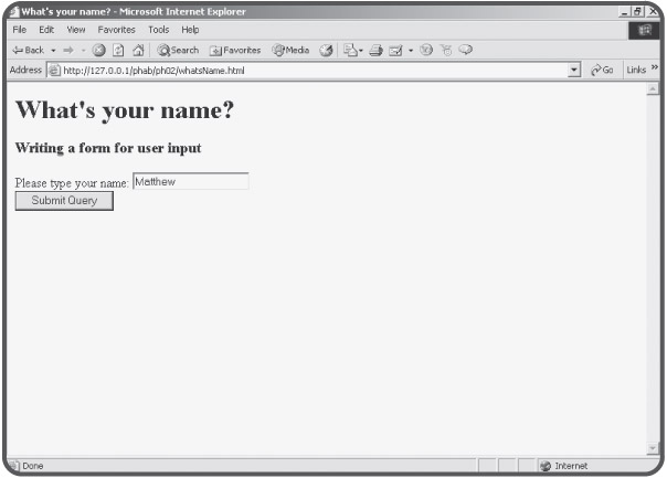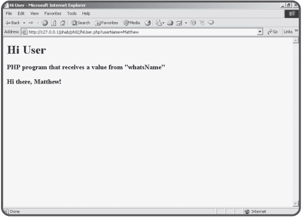 The whatsName.html page does not contain any PHP at all. It's simply an HTML page with a form on it. When the user clicks on the Submit Query button, the page sends the value in the text area to a PHP program called hiUser.php. Figure 2.8 shows what happens when the hiUser.php program runs: