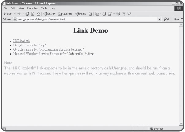 Sometimes it can be very handy to send data to a server-side program without necessarily using a form. This is a little-known trick that can really enhance your Web pages without requiring a lick of PHP programming. The Link Demo page (linkDemo.html) shown in Figures 2.9 and 2.10 illustrate this phenomenon.