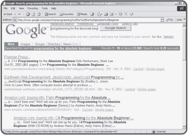 "http://www.google.com/search?q=programming for the absolute beginner">
