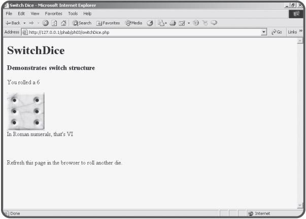 <html> <head> <title>Switch Dice</title> </head> <body> <h1>SwitchDice</h1> <h3>Demonstrates switch structure</h3> <? $roll = rand(1,6); print "You rolled a $roll"; print "<br>"; switch ($roll){ case 1: $romValue = "I"; break; case 2: $romValue = "II"; break; case 3: $romValue = "III"; break; case 4: $romValue = "IV"; break; case 5: $romValue = "V"; break; case 6: $romValue = "VI"; break; default: print "This is an illegal die!"; } // end switch print "<br>"; print "<img src = die$roll.jpg>"; print "<br>"; print "In Roman numerals, that's $romValue"; print "<br>"; print "<br>"; print "<br>"; ?> <br> Refresh this page in the browser to roll another die. </body> </html>