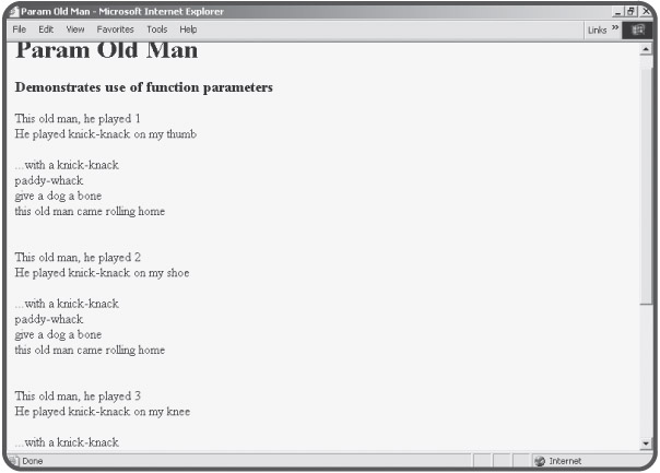 Functions are meant to be self-contained. This is good because the entire program can be too complex to understand. If you break the complex program into smaller functions, each function can be set up to work independently. When you work inside a function, you don't have to worry about anything outside the function. If you create a variable inside a function, that variable dies as soon as you leave the function. This prevents many errors that can otherwise creep into your code. The bad side of functions being so self-contained is you often want them to work with data from the outside program. There are a couple of ways to do this. You can send a parameter to a function, which allows you to determine one or more values sent to the function as it starts. Each function can also have a return value. An example will make this more clear. The param program, shown in Figure 3.13 illustrates another form of the This Old Man song. Although again the user might not be aware of it, there are some important differences between this more sophisticated program and the first This Old Man program.