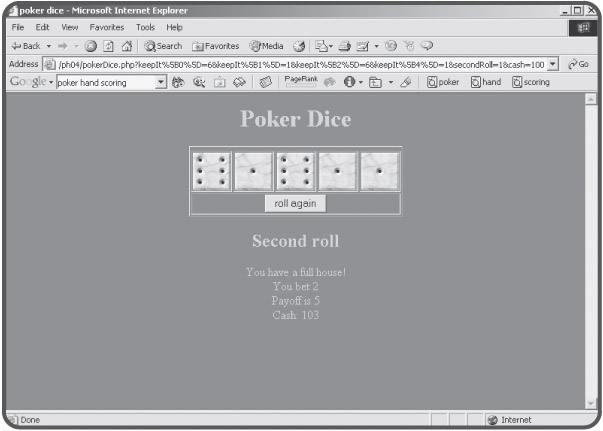 The main program for this chapter is a simplified dice game. In this game, you are given $100 dollars of virtual money. On each turn, you bet two dollars. The computer will roll five dice. You can elect to keep each die or roll it again. On the second roll, the computer checks for various combinations. You can earn money back for rolling pairs, triples, four and five of a kind, and straights (five numbers in a row) Figures 4.1 and 4.2 illustrate the game in action.