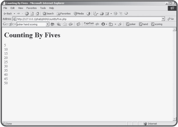 The countByFive.php program shown in Figure 4.4 illustrates a program that counts by fives.