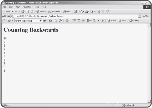 If you understand how for loops work, the changes will all make sense. I'm counting backwards this time, so $i begins with a large value (in this case 10.) The condition for continuing the loop is now $i > 0, which means the loop will continue as long as $i is greater than zero. As soon as $i is zero or less, the loop will end. Note that rather than adding a value to $i, this time I decrement by one each time through the loop. If you're counting backwards, you must be very careful that the sentry variable has a mechanism for getting smaller, or the loop will never end. Recall that $i++ adds one to $i. $i- - subtracts one from $i.