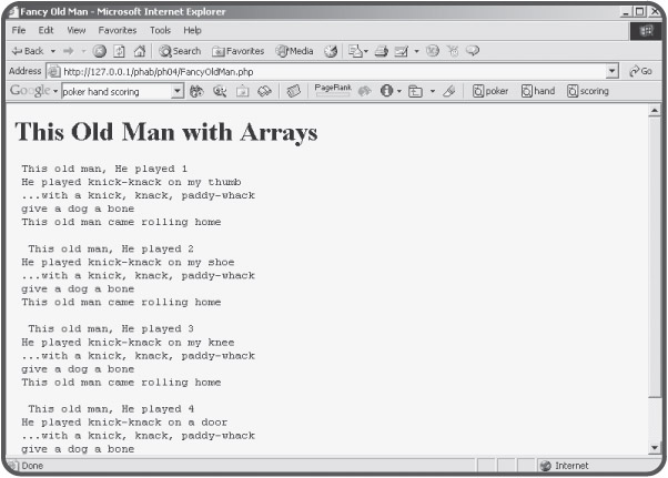 The basicArray.php program shows how to build arrays, but it doesn't illustrate the power of arrays and loops working together. To see how these features can help you, let's revisit an old friend from the last Chapter 3, "Controlling Your Code with Conditions and Functions." The version of the "This Old Man" program featured in Figure 4.8 looks a lot like it did in Chapter 3, but the code is quite a bit more compact.