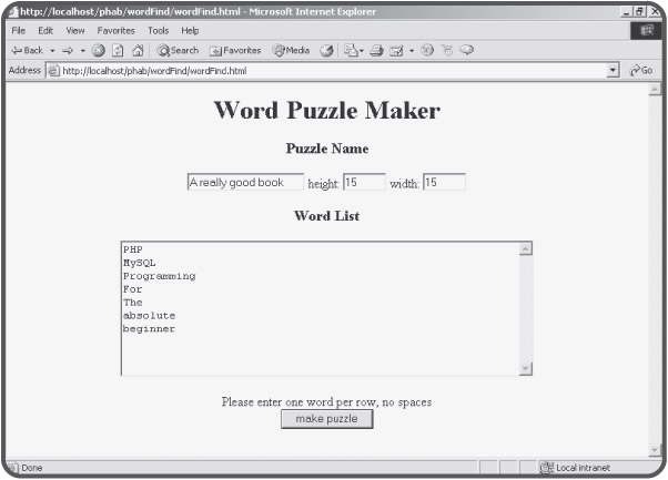 By the end of this chapter, you will be able to create a fun program that generates word search puzzles. The user will enter a series of words into a list box, as shown in Figure 5.1.
