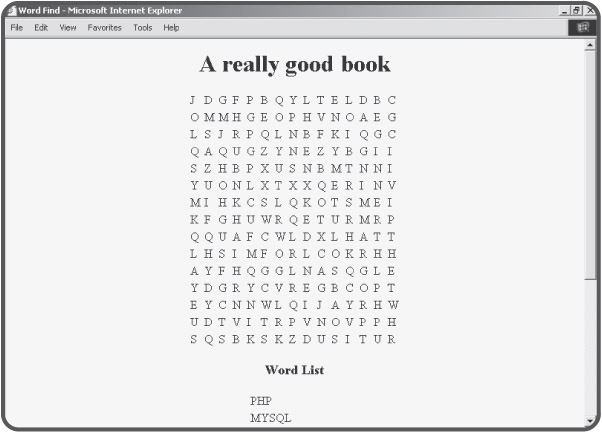The program then tries to generate a word search based on the user's word list. (It isn't always possible, but the program can usually generate a legal puzzle.) One possible solution for the word list shown in Figure 5.1 is demonstrated in Figure 5.2.