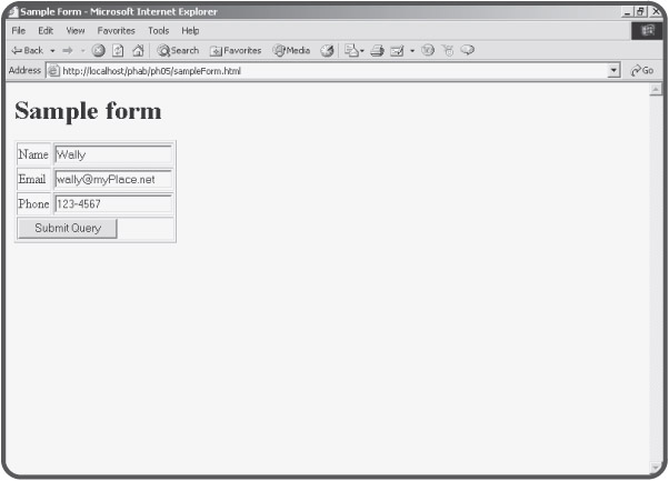 The formReader.php program is actually one of the first PHP programs I ever wrote, and it's one I use frequently. It's very handy, because it can take the input from any HTML form and report back the names and values of each of the form elements on the page. To illustrate, Figure 5.6 shows a typical Web page with a form.