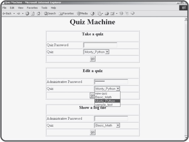 Figure 6.1 shows the main page of the system. The user will need a password to take a test, and a different administrator password to edit a test. In this case, I've entered the administrative password (it's "absolute" - like in "absolute beginner's guide") into the appropriate password box, and I'm going to edit the Monty Python quiz.