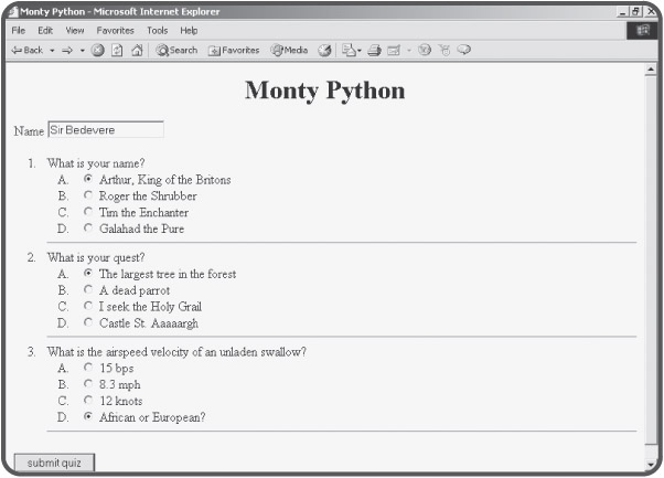 Users with knowledge of the appropriate password can take any of the quizzes known to the system. If a user chooses to take the Monty Python quiz, the screen shown in Figure 6.3 appears.