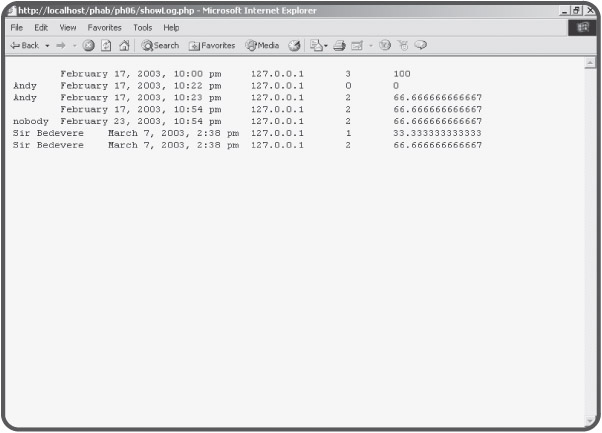 The system keeps a log file for each quiz so the administrator can tell the scores of each person who took the quiz. Figure 6.5 shows how people have done on the Monty Python quiz.