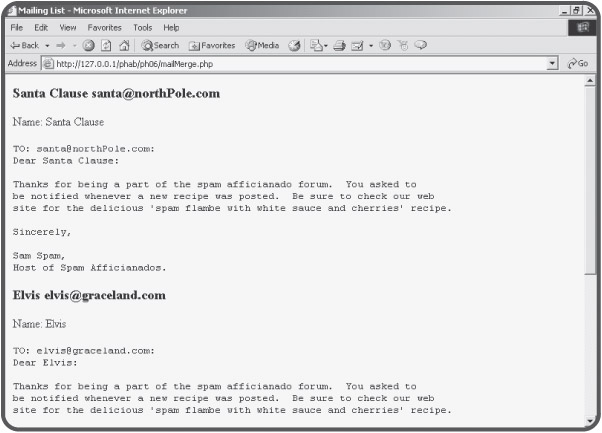 You might recall the split() function from Chapter 5, "Better Arrays and String Handling." This function is used to separate elements of a string based on some delimiter. I used the split() function inside a foreach loop to break each line into its constituent values. However, I really didn't want an array in this situation. Instead, I wanted the first value on the line to be read into the $name variable, and the second value should be stored in $email. The list() function allows you to take an array and distribute its contents into scalar (non-array) variables. In this particular situation, I never stored the results of the split() function in an array at all, but immediately listed the contents into the appropriate scalar variables. Once the data is in the variables, it can be easily interpolated into a mail-merge message.