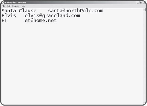 The data file (shown in Figure 6.10) for this program is simply a file created in Notepad. Each line consists of a name and an e-mail address, separated by a tab character.
