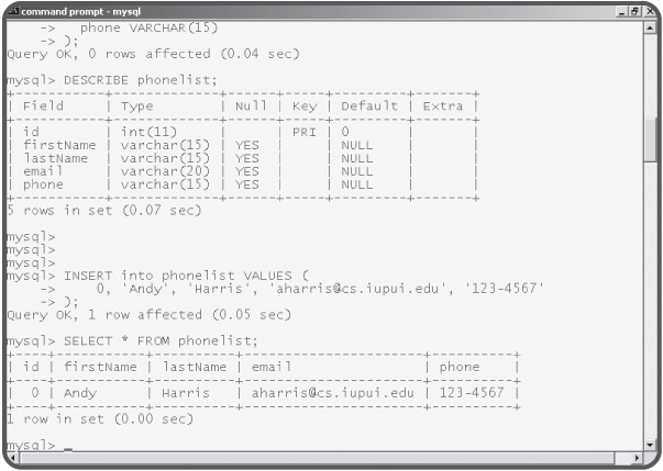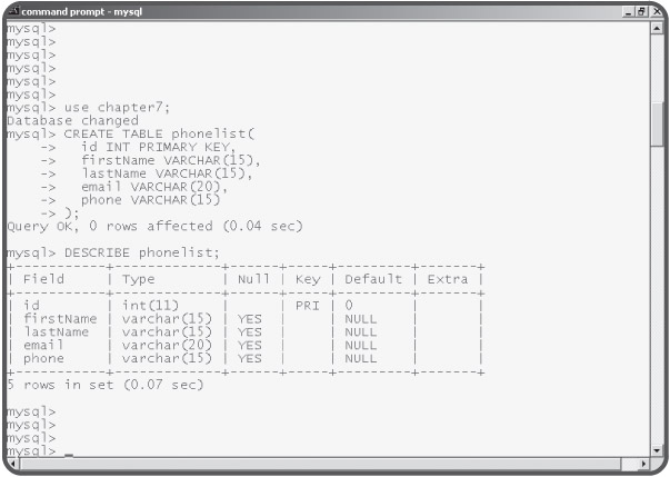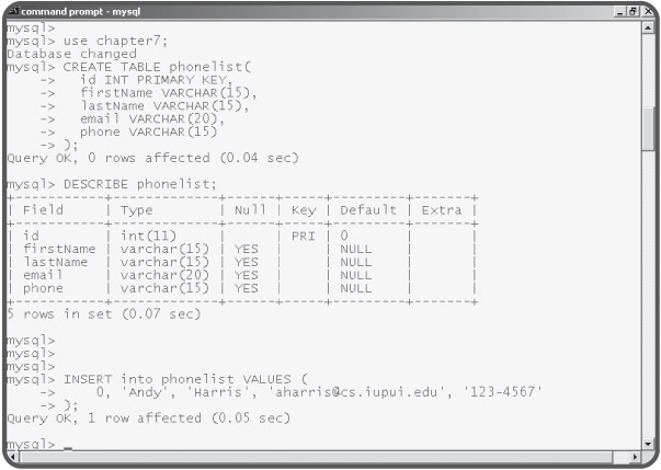 The code presented so far can be entered directly into the MySQL program. You can see the code and its results in Figure 7.6.