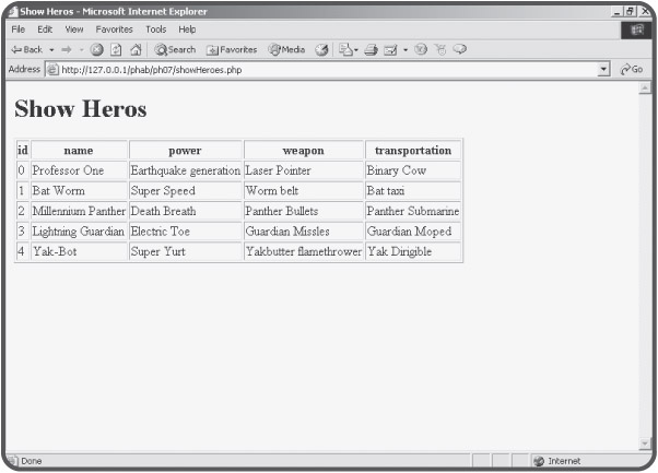 <body> <h1>Show Heros</h1> <? //make the database connection $conn = mysql_connect("localhost", "", ""); mysql_select_db("chapter7", $conn); //create a query $sql = "SELECT * FROM hero"; $result = mysql_query($sql, $conn); print "<table border = 1>\n"; //get field names print "<tr>\n"; while ($field = mysql_fetch_field($result)){ print " <th>$field->name</th>\n"; } // end while print "</tr>\n\n"; //get row data as an associative array while ($row = mysql_fetch_assoc($result)){ print "<tr>\n"; //look at each field foreach ($row as $col=>$val){ print " <td>$val</td>\n"; } // end foreach print "</tr>\n\n"; }// end while print "</table>\n"; ?> </body> </html>