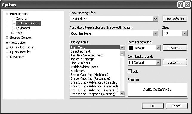 As you can see, Query Editor supports authoring and executing multiple query types, including Analysis Services and SQL Server Mobile. Analysis Services querying capabilities are covered in great depth in Chapter 14, "Inside Analysis Services Data Mining Tools." Functionally, a SQL Server Mobile query is a subset of a Database Engine query and differs only in the connection type. Upon connection you need to either provide a valid database connection file or create a new one. Because query syntax is also just a subset of true SQL, the query carries the extension sqlce instead of sql. Let's concentrate our efforts on Query Editor support for SQL Server Database Engine. After you type a query, you typically want to execute it against the database engine right away to see the results. You can do it directly from the standard tool bar, using the Execute button. Tips and Tricks Several hotkey combinations in Query Editor perform the same function (F5, Ctrl+E, Alt+X). You can pick the hotkey combination you feel most comfortable with, depending on your background. By default, results appear in the bottom pane in grid format. You can switch the view to display textual output directly. This option comes in handy if you want to cut and paste text. If you want to change the font used by Query Editor, you can easily change it by following the Tools > Options menu items. Keep in mind that new settings will be global and not for a particular instance of your authoring session, so after you are finished, you need to go back and restore the defaults by clicking the Use Defaults button, as shown in Figure 5-2. Figure 5-2. Query Editor: Changing fonts and colors.