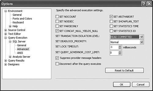 From the same Options dialog, you can also change many of the configuration options for Query Execution, as shown in Figure 5-3. Figure 5-3. Query Editor for SQL Server Database Engine Advanced Execution options.
