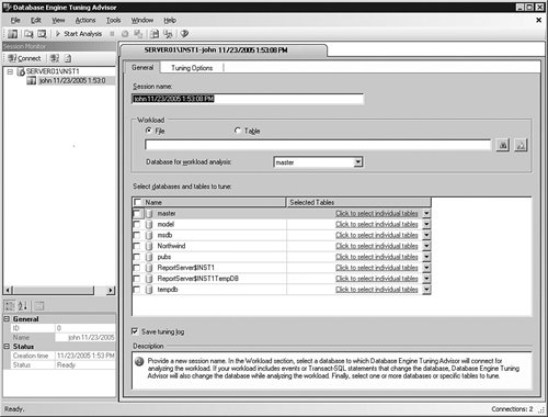 Database Tuning AdvisorDatabase Engine Tuning Advisor (DTA) is a brand new tool that replaced the previously shipped Index Tuning Wizard (ITW). However, this is not just a name change. DTA is a full-blown application that has many powerful features never available in the old tool. Let's try to start a simple tuning session to better understand DTA's capabilities. You can launch the tool from the Start menu. DTA is located under the Microsoft SQL Server 2005\Performance Tools folder. Tips and Tricks Using the Start menu is not the only way to launch DTA. The tool can be launched from within SQL Server Management Studio Query Editor window by following the Analyze Query in Database Engine Tuning Advisor menu selection. In this case DTA will be launched with pre-populated workload information, connection, and database context. If a portion of the text was selected in Query Editor window, it will become the default query to be analyzed instead of the entire script. Tips and Tricks Upon initial installation of SQL Server 2005, you need to run the tool first by connecting to Database Engine as a member of the sysadmin fixed server role. During the initial connection, DTA goes through an initialization process by creating special objects on the SQL Server Database Engine instance. After the first run, the application repository database is fully initialized, and from that point forward any user who is a member of the db_owner fixed database role can use DTA to tune tables on databases on his or her own. Immediately after launching the tool you are presented with a connection dialog. After you establish a Database Engine connection you come to a new session creation screen, shown in Figure 7-19. Figure 7-19. Database Tuning Advisornew session creation.