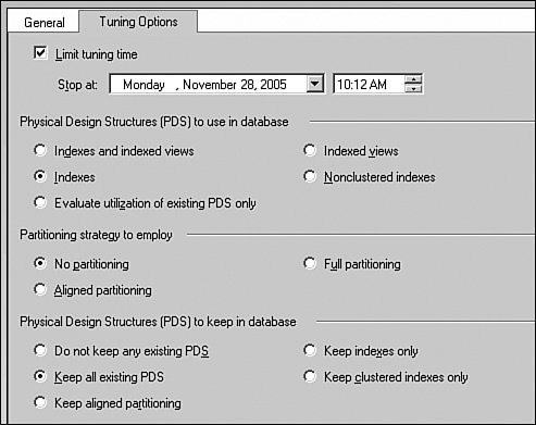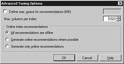 The first thing to note is a time limit on how long tuning should proceed. DTA runs for a predetermined amount of time and gives the best set of recommendations it's able to come up with under the constraints. This enables you to schedule tuning in the time window allocated for database maintenance without affecting other clients. A list of different tuning options and their meanings is presented in the Table 7-1.