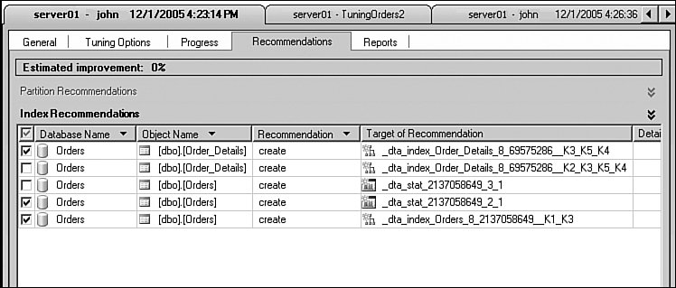 Here you have an opportunity to limit the maximum space consumed by recommended physical data structures and the maximum number of columns per index, covering included columns as well. This enables users to impose online recommendation constraints on the tuning engine. Assuming you are happy with all selected tuning options, you can start analysis from the toolbar or by selecting the Actions, Start Analysis menu item. The first phase of the tuning process as indicated by the progress report is called "Submitting Configuration Information." During this phase, all tuning options become part of the newly generated configuration XML that gets entered into the MSDB database through a special configuration stored procedure. After the tuning session is fully configured, the tuning engine gets invoked. While running, the tuning engine starts consuming a workload file or table data, at the same time performing incremental tuning analysis. Finally, reports and recommendations are generated and ready for examination. At this point, the user can selectively apply recommendations right away, schedule applying recommendations later, or save the recommendations script for future use. All these options are available from the Actions menu. Before applying recommendations you can selectively choose which ones you would like to apply by using check boxes, as shown in Figure 7-22. Figure 7-22. DTA recommendations.