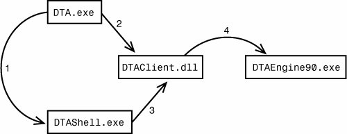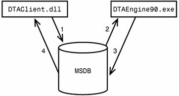 There is a command line interface to DTA called DTA.exe. It supports most of the options exposed through the user interface. Tips and Tricks You can always get a full list of options supported by the tool by using the -? switch as follows: C:\>DTA.exe -? When invoked with the u flag, DTA.exe launches a graphical interface to DTA called DTAShell.exe (1) and passes all supplied options to it as well. If a user intends to perform tuning via the console, DTA.exe makes direct calls to the DTAClient.dll (2) shared component. DTAShell.exe also uses shared components for tuning (3). The DTAClient.dll component contains the necessary infrastructure to create a proper XML configuration file and store it in the MSDB database. When the tuning session is created, it calls the DTAEngine90.exe component that actually performs the tuning. Because the DTAEngine90.exe is running as a separate process, it is possible to close the graphical tool and continue tuning in the background. DTA interactions between DTAClient.dll and DTAEngine90.exe always happen via reading and writing to the MSDB database, as shown in Figure 7-24. Figure 7-24. DTA component interactions via MSDB database.