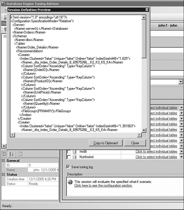 Before first launching the DTAEngine90.exe process, the DTAClient.dll writes session information into the database (1). After it is running, DTAEngine90.exe consumes the information straight from MSDB (2). As tuning progresses it continues to update progress information in MSDB, eventually producing tuning recommendations (3). Tuning recommendations and reports are consumed by console or graphical tool from MSDB (4). This closes the interaction loop between DTA components. Tips and Tricks All information exchanged between different DTA components is in XML. The XML input file uses the published Database Engine Tuning Advisor XML schema, which can be found at the following location in your Microsoft SQL Server 2005 installation directory:C:\Program Files\Microsoft SQL Server\90\Tools\Binn\schemas\sqlserver\2003\03\dta\dtaschema.xsd Evaluative TuningOne very important action available after tuning is done is "Evaluate Recommendations." You can use this to pick and choose from a set of recommendations provided by the tool to evaluate the impact of applying a subset of those recommendations. When this menu item is selected, a new tuning session is created with essentially the same options as the old one, but a modified configuration XML section now contains the subset of selected recommendations. Tips and Tricks You don't have to stop with working only with a subset of given recommendations. You can actually learn the format of the XML configuration file and supply your own custom recommendations to the tool for evaluation. To see the configuration section, use the link provided at the bottom of the session screen (see Figure 7-25). Figure 7-25. DTA configuration section of XML document.