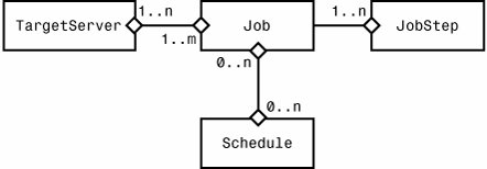 Later in this chapter, during the coverage of proxy accounts, you will find a discussion on the security aspects of running different tasks and their run-time execution credentials. Another important aspect of these task execution environments, the per-subsystem thread pool limit, will be covered as part of the general SQL Server Agent architecture. Tips and Tricks In previous releases of SQL Server, all subsystem information was stored in the Registry. In SQL Server 2005, you can get general information about SQL Server Agent subsystems by looking directly at the contents of the msdb.dbo.syssubsystems table, using any SQL Server Database Engine query tool, such as Query Editor or SqlCmd. All subsystems are loaded upon SQL Server Agent service startup. However, the SSIS subsystem may be deployed or removed later (after SQL Server Agent is already running), as part of a separate installation. SQL Server Agent can handle reconfiguration of this particular subsystem dynamically and does not require a restart. Warning Do not attempt to modify the contents of the msdb.dbo.syssubsystems table directly or certain tasks may not function properly. If a particular subsystem fails to load, jobs that have job steps belonging to that subsystem get marked internally as "suspended" and cannot be reset back to normal programmatically. There are two ways to fix the situation if it happens. First, jobs can be deleted and then re-created. Another option is to restart the SQL Server Agent service. Jobs and Job StepsSQL Server Agent tasks are called job steps. They are executed as part of a larger entity called a job. A single job can contain multiple job steps of any supported type already described. Most jobs are scheduled to run regularly via the SQL Server Agent scheduling mechanism. Tips and Tricks In previous releases of SQL Server, the job schedule was tied directly to a specific job and could never be reused. In SQL Server 2005, a user can create a schedule and then link multiple jobs to it. However, other users cannot link to a shared job schedule for security reasons. In addition to running on a schedule, jobs can started by direct TSQL commands through use of the sp_start_job stored procedure, they can be triggered by an alert, instructed to run during CPU idle cycles, or they can be directed to run by a master server in a MSX/TSX (master server/target server) distributed execution environment. Conceptually, jobs, job steps, and job schedules are connected together, as shown in Figure 8-1. Figure 8-1. SQL Server Agent job conceptual diagram.