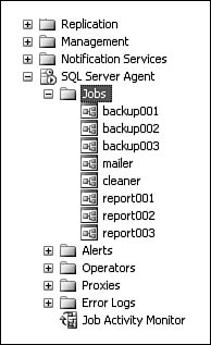 As you can see from the diagram, a single job can consist of multiple job steps, can execute on multiple target servers, and can be linked to multiple schedules. Creating JobsThe Jobs folder appears under the SQL Server Agent node in the tree view of SQL Server Management Studio (the Object Explorer). By expanding the Jobs folder, you can see a list of all jobs currently configured on your server as shown in Figure 8-2. Figure 8-2. Object Explorer view of the Jobs folder.
