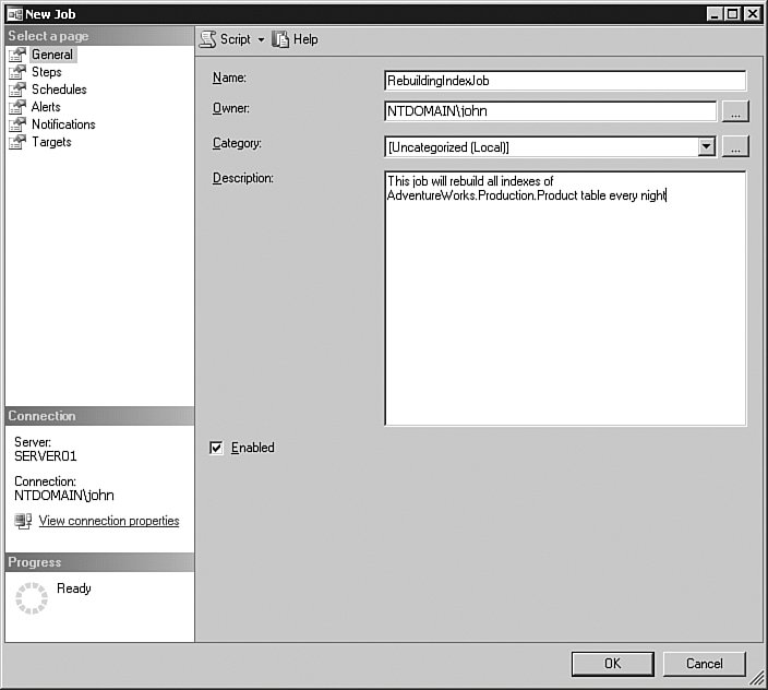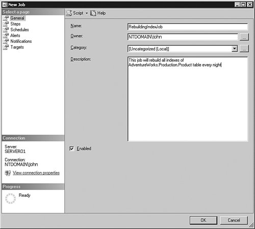 Suppose you want to create a job that automatically rebuilds an index on one of your tables every night. We will walk through this scenario step by step to demonstrate the process of creating a simple job through the graphical user interface. Later we examine the stored procedure calls that the graphical tool calls behind the scenes to run SQL Server Agent. Right-click the Jobs folder to bring up the New Job option. Select New Job, and you will see the dialog for creating new jobs. On the General page (see Figure 8-3) fill in the job name and a brief description of the job functionality. Although providing the job description is optional, a good set of comments will help others understand your intentions later on and cut down on other users contacting you unnecessarily. By default, the Owner field will show all currently logged on users. As the system administrator, you can access more options by clicking the Browse button (...) on the right. Leave the default value for job category since it is used only to group different jobs for display purposes, but does not effect how a job is executed. After filling in job information, click on Steps in the Select a page tree view on the left to create at least one job step for the job. Figure 8-3. New Job creation dialoggeneral page.