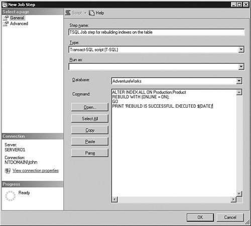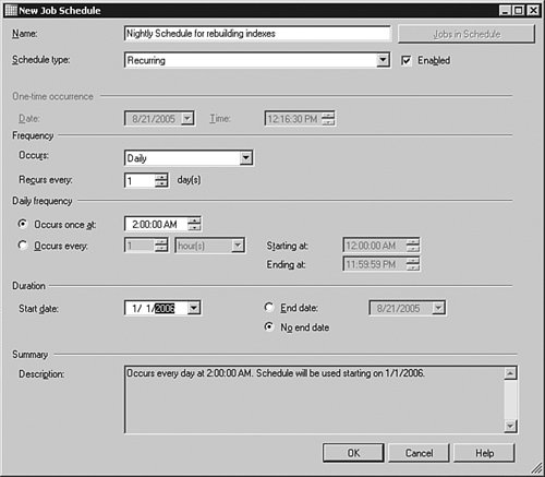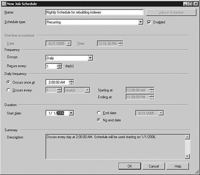 This schedule should be recurring, executing daily at 2:00 AM. Now it's necessary to decide whether it will execute forever or have some finite end date. With schedule creation over, it's time to finish the job creation process. Before that, you might want to ask SQL Server Management Studio to script the entire job creation process to a new Query Editor window by selecting the Script menu option. The following is the approximate script that gets created and split into logical pieces. The first stored procedure call creates a SQL Server Agent job object and obtains a job identifier to report to the caller. DECLARE @jobId BINARY(16) EXEC msdb.dbo.sp_add_job @job_name=N'RebuildingIndexJob', @enabled=1, @notify_level_eventlog=0, @notify_level_email=2, @notify_level_netsend=2, @notify_level_page=2, @delete_level=0, @description=N'This job will rebuild all indexes of AdventureWorks.Production Then the job gets associated with the job server that is going to run it. EXEC msdb.dbo.sp_add_jobserver @job_name=N'RebuildingIndexJob', @server_name = N'KOMODO_P6' The next thing is to add a job step to the job providing all necessary execution details. EXEC msdb.dbo.sp_add_jobstep @job_name=N'RebuildingIndexJob',