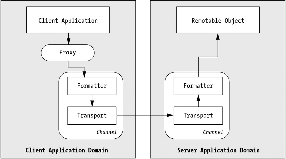 The Remoting model shown in Figure 2-2 simplifies a few details and collapses the Remoting infrastructure down to a single layer. In reality, a Remoting call is routed through several channel sinks in a set order, each of which performs an important task. By default, the first channel sink is the formatter, which encodes the message in SOAP or binary representation. The final channel sink is always the transport channel, which routes the message using the appropriate transport protocol. This model is diagrammed in Figure 3-11.